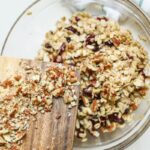 - Chauffer le miel, l’huile de coco et le jus d’orange quelques minutes. Ajouter les flocons d’avoine, les graines et les oléagineux (concasser grossièrement les noix du Brésil).